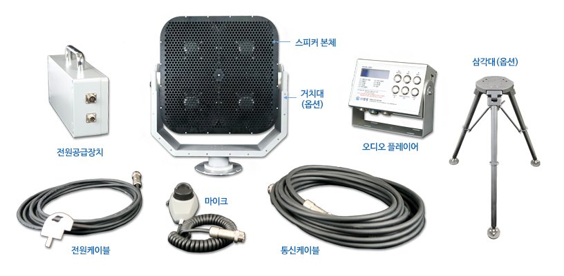 - 142dB이상의 최대출력을 가지고 있어 주변 소음을 극복하고 차량이나 선박 또는 건물 내부까지 크고 명확한 의사전달 및 경고방송을 할 수 있어 기존 방송 시스템 (P.A. System)의 한계를 극복할 수 있습니다.